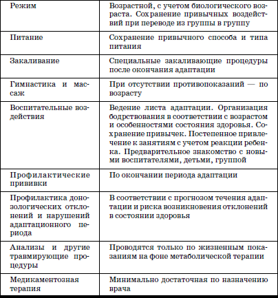 Как правило, детям первого и второго года жизни на период адаптации лучше назначить режим на один возрастной период ниже. Нормализация показателей поведения будет сигналом к переводу ребенка на физиологический возрастной режим. Однако еще в течение недели следует более пристально наблюдать за ребенком, так как перевод на обычный режим иногда вызывает резкое ухудшение эмоционального состояния.