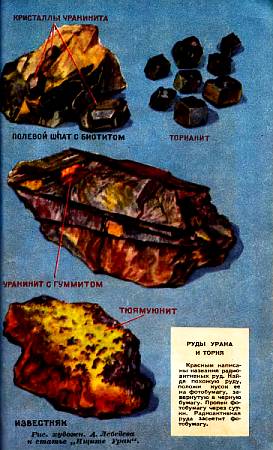 РУДЫ УРАНА И ТОРИЯ. Красным написаны названия радиоактивных руд. Найдя похожую руду, положи кусок ее на фотобумагу, завернутую в черную бумагу. Прояви фотобумагу через сутки. Радиоактивная руда засветит фотобумагу.