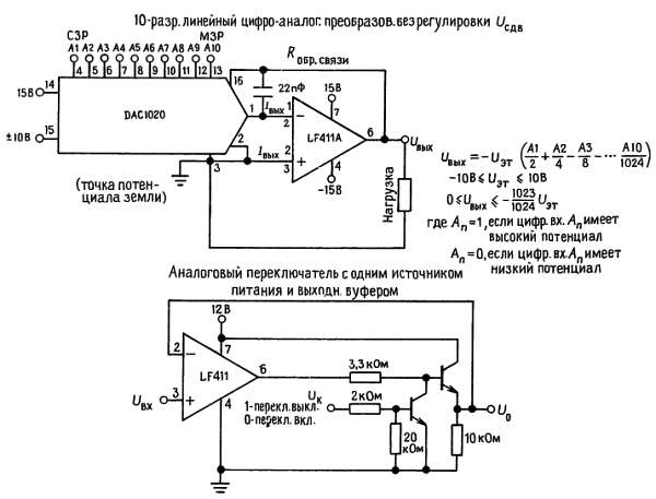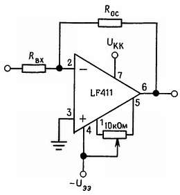 Для элемента LF411 смещение задается зенеровским диодом, что обеспечивает нормальную работу схемы при величине питающего напряжения +4,5 В. Меньшие значения питающего напряжения могут привести к меньшим значениям ширины полосы пропускания и скорости нарастания. На нагрузочном сопротивлении величиной 2 кОм схема LF411 создает напряжение величиной +10 В в полном температурном диапазоне. Большие токи нагрузки могут, однако привести к увеличению входного напряжения сдвига в отрицательном диапазоне изменения питающего напряжения и в конечном итоге к достижению предельной величины активного тока как в положительном, так и в отрицательном диапазоне изменения питающего напряжения.