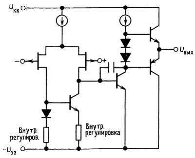 Превышение предельного значения отрицательного синфазного сигнала на любом из входов приводит к тому, что фаза на выходе изменяется на противоположную и на выходе усилителя устанавливается соответствующий высокий или низкий уровень. Превышение предельного значения отрицательного синфазного сигнала на обоих входах приводит к тому, что на выходе усилителя устанавливается высокий уровень. Ни в одном из случаев не происходит защелкивания, так как возвращение сигнала в пределы диапазона синфазных сигналов снова приводит входной каскад, а следовательно, и усилитель в нормальное рабочее состояние.
