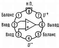 Вид сверху. Примечание: выход 4 соединен с корпусом. Порядковый номер LF411AMH, LF411MH, LF411CH или LF411CH, см. корпус типа Н08Н фирмы National Semiconductor.