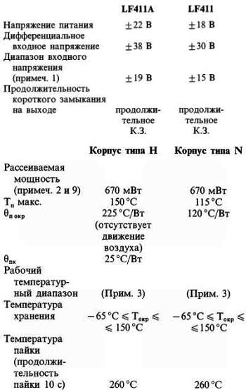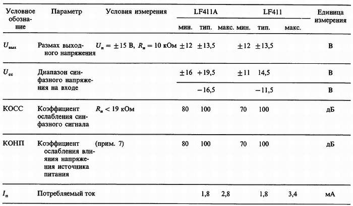 Примечание 7. Коэффициент ослабления влияния напряжения источника питания в соответствии с принятой методикой измеряется при одновременном увеличении или уменьшении обоих источников, от ±15 В до ±5 В для LF411 и от ±20 В до ±5 В для LF411А.