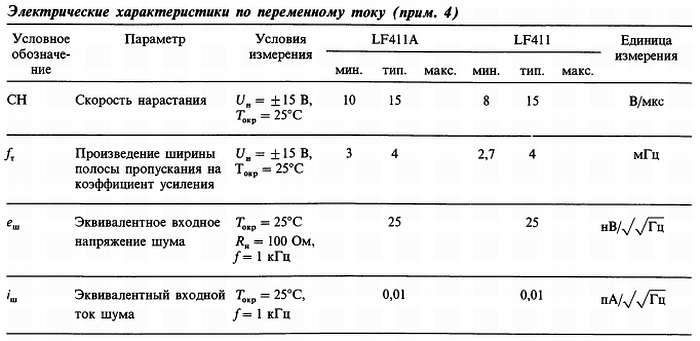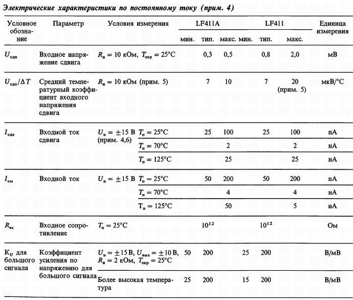 Примечание 5. Элемент LF411A проверяется на соответствие характеристикам в полном объеме партии — 100 %. Элемент LF411 подвергается выборочной проверке, характеристикам должны соответствовать не менее 90 % элементов из партии.