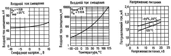 Примечание 6. Входные токи смещения представляют собой токи утечки переходов, они удваиваются каждый раз при увеличении температуры перехода Iп на 10 °C. В связи с тем что время испытаний продукции ограничено, входные токи смещения коррелированы с температурой перехода. При нормальной работе температура перехода в результате внутреннего рассеивания Ррасс превышает температуру окружающей среды Тп = Токр + θп окрРрасс, где θп окр — температурное сопротивление между переходом и окружающей средой. Теплоотвод рекомендуется использовать в тех случаях, когда входной ток смещения должен быть минимальным.