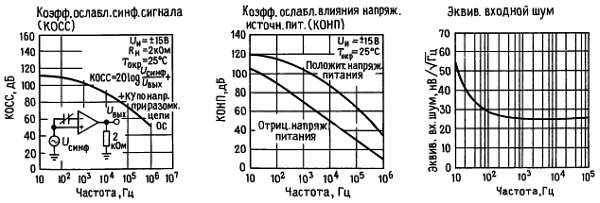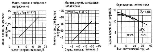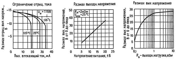 Превышение предельного значения положительного синфазного сигнала на одном из входов не изменяет фазу на выходе, однако если предел будет превышен на обоих входах, то на выходе усилителя установится высокий уровень. Эти усилители будут работать, если синфазное входное напряжение будет равно положительному питающему напряжению, однако в этих условиях ширина полосы пропускания и скорость нарастания могут уменьшиться. При изменении отрицательного синфазного сигнала на 3 В относительно отрицательного питающего напряжения может произойти увеличение входного напряжения сдвига.