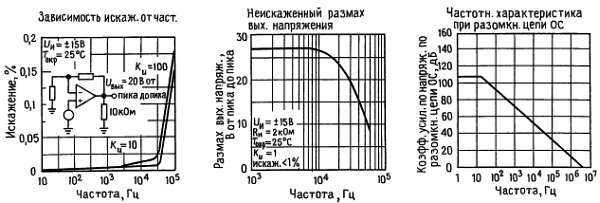 • небольшое искажение гармонической составляющей, при КU = 10, Rн = 10 кОм, Uвнх = 2Uот пика до пика, ширина полосы = 20 Гц-20 кГц… < 0,02 %