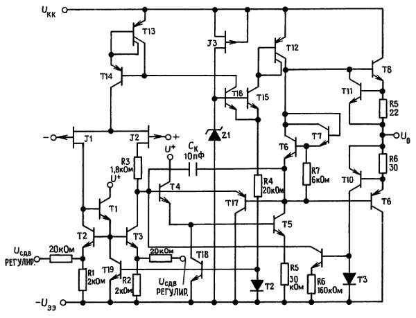 Полевые транзисторы с р-n-переходом имеют большое обратное напряжение пробоя между затвором, истоком и стоком, это устраняет необходимость ограничения напряжения на входах. Следовательно, вполне можно использовать большие дифференциальные входные напряжения без значительного увеличения входного тока. Максимальное значение дифференциального входного напряжения не зависит от питающих напряжений. Однако ни одно из входных напряжений не должно выходить за пределы отрицательного напряжения питания, так как это может привести к большим токам и может закончиться разрушением схемы.