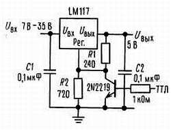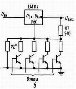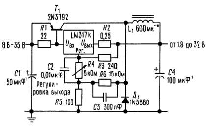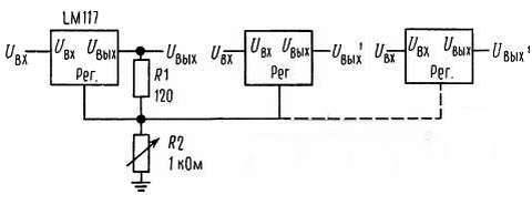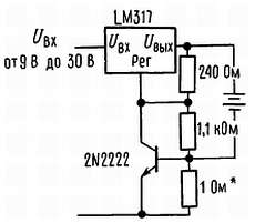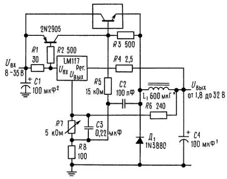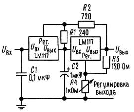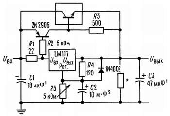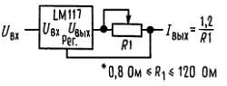 На основе этой схемы достаточно просто построить импульсный стабилизатор, стабилизатор с программируемым выходом, а при включении между выходом и выводом регулировки фиксированного резистора LM117 можно использовать в качестве прецизионного стабилизатора тока[8]. Можно получить источник с электронным выключением, если закорачивать вывод регулировки на землю; при этом на выходе будем иметь 1,2 В, т. е. напряжение, соответствующее очень малому току для большинства нагрузок.