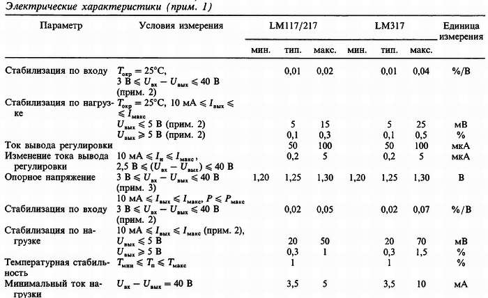 Общее описание. Интегральные схемы LM117/LM217/LM317 представляют собой регулируемые 3-выводные стабилизаторы положительного напряжения, обеспечивающие выходной ток 1,5 А в диапазоне выходного напряжения от 1,2 до 37 В. Они очень удобны в обращении и требуют только два внешних резистора для установки выходного напряжения. Стабилизация по сети (по входу) и по нагрузке выше, чем при использовании стандартных фиксированных (заземленных) стабилизаторов. Кроме того, LM117 размещен в стандартных транзисторных корпусах, которые удобно устанавливать на печатных платах.