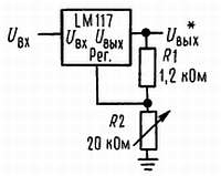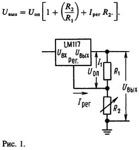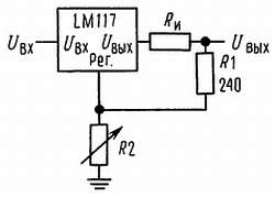 Включенный LM117 формирует опорное напряжение Uоп с номинальным значением 1,25 В между выходом схемы и выводом регулировки (рис. 1). Опорное напряжение падает на программирующем резисторе R1, и так как это напряжение является постоянным, то через резистор установки выхода R2 протекает постоянный ток, определяющий выходное напряжение: