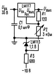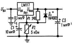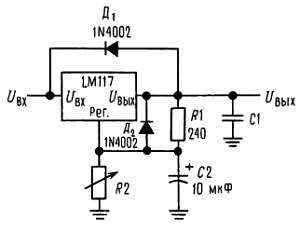 На рис. 3 показан стабилизатор LM117 с защитными диодами, которые предназначены для выходных напряжений выше 25 В и больших выходных емкостей.