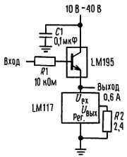 Импульсный стабилизатор на 4 А с защитой от перегрузки (три LM195, соединенные параллельно, обозначены транзистором в прямоугольнике).