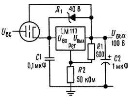 Обычно конденсаторы не требуются, если только устройство не расположено вдалеке от входных фильтрующих конденсаторов. В этом случае вход необходимо шунтировать. Дополнительный выходной конденсатор можно использовать для улучшения переходной характеристики. Если зашунтировать вывод регулировки, то можно получить очень высокие значения коэффициента ослабления пульсаций, которые трудно получить с помощью стандартных 3-выводных стабилизаторов. Помимо того что LM117 заменяет фиксированные стабилизаторы, эта интегральная схема находит широкое применение и в других приложениях. В связи с тем что стабилизатор является «плавающим» и для него имеет значение только разность (перепад) напряжения между входом и выходом, можно строить источники на напряжения до нескольких сотен вольт; ограничение накладывается только превышением максимума перепада напряжений между входом и выходом.