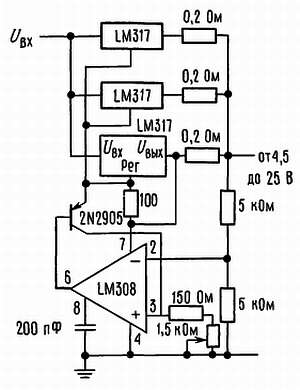 Высокоточный регулируемый стабилизатор напряжения (три LM195, соединенные параллельно, обозначены как транзистор в прямоугольнике).