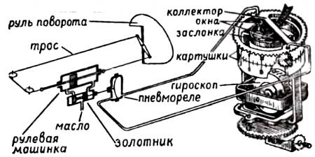 Если самолет отклонится от курса, например, вправо, то коллектор вместе с ним повернется по отношению к заслонке (она-то ведь не повернется, ибо положение гироскопа не изменяется) и заслонка перекроет правое окно. Воздух, поступающий в коллектор, не сможет итти вправо, а пойдет только влево. Он дойдет по трубке до пневмореле и изогнет мембрану. Это вызовет смещение золотника влево, что откроет доступ маслу в правую часть рулевой машинки. Здесь масло нажмет на поршень, который через трос повернет влево руль, — самолет возвратится на прежний курс.