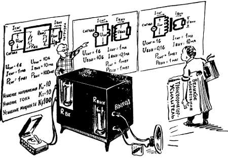 Похожие результаты мы получим, если сравним мощность, которую дает фотоэлемент, с мощностью, которая нужна, чтобы двинуть стальную руку контролера-автомата в метро. Или если сравним входную и выходную мощность электронного регулятора температуры, прибора для записи биотоков мозга, установки для регистрации землетрясений, электронных блоков радиоуправляемой модели или, наконец, обычного магнитофона.