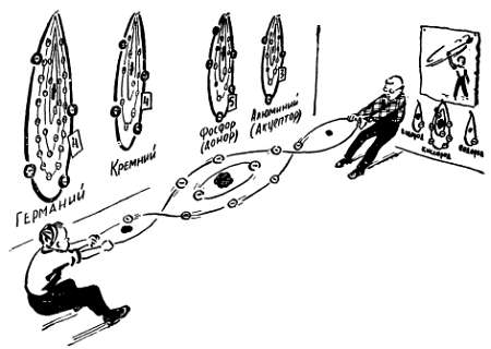 Удельное сопротивление германия составляет примерно 50 ом·см, кремния — 1000 000 ом·см. Обе эти цифры относятся лишь к химически чистым веществам: даже небольшие доли примесей могут менять удельное сопротивление германия и кремния во много тысяч раз. Чтобы понять, как происходит такое резкое изменение электрических свойств полупроводника, нам придется несколько дополнить свои представления о возникновении и передвижении свободных электрических зарядов. Для этого мы сейчас мысленно нарисуем две очень упрощенные картинки, которые хотя и несколько искажают действительность, но зато позволяют в простом виде представить себе очень сложный процесс.