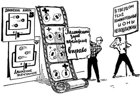 Здесь нельзя не вспомнить хорошо известную аналогию. В театре во время спектакля освободилось место в первом ряду. На него сейчас же пересел зритель со второго ряда. На место, освободившееся во втором ряду, пересел зритель из третьего ряда. На его место пересел кто-то из четвертого ряда, и так продолжалось до тех пор, пока свободное место не оказалось в самом последнем ряду. С места на место перебегали люди (электроны-перебежчики), а в результате по залу от первого ряда до последнего переместилось свободное место (дырка).
