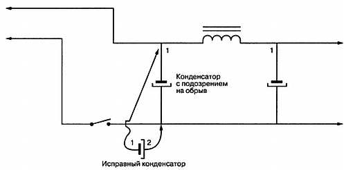 Когда специалист по поиску неисправностей подозревает, что элемент (обычно конденсатор) вышел из строя, он помещает хороший элемент в схему параллельно подозрительному. Если схема начинает работать, значит, проблема локализована. Это называется шунтирование. Специалист может сэкономить драгоценное время таким способом (рис. 1.4). Помните, однако, что использование этой техники обычно ограничено элементами, где произошел обрыв, а не короткое замыкание. Шунтирование замкнутого элемента может не иметь результата или привести к повреждению нового элемента.