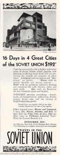 Турагентство «Интурист» действительно было организовано еще 1929 году и активно рекламировалось в американской прессе. Предлагалось испробовать легендарный Транссиб, восхититься Днепрогэсом, пройтись по живописному Кавказу.
