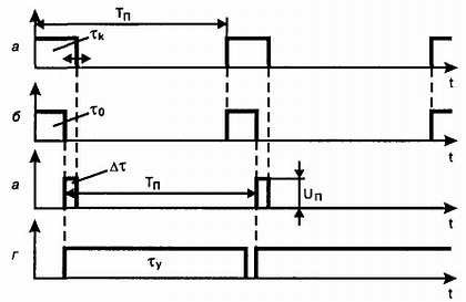 Вырабатываемый этим устройством опорный импульс длительностью τ0 = 1,5 мс подается на второй вход различителя. Последний работает таким образом, что при τк > τ0 разностный сигнал Ат появляется на верхнем, по схеме, выходе, а при τк < τ0 — соответственно на нижнем. Вид разностного сигнала показан на рис. 1.4, в.