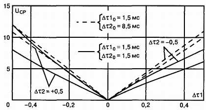 На рис. 1.6 изображены зависимости напряжения Ucp для одного канала от длительности разностного импульса этого канала (Δτ1) при различных значениях разностного импульса (Δτ2) в другом канале. Кривые построены по формуле 1.2. Сплошные линии соответствуют одинаковой исходной длительности канальных импульсов τ10 = τ20 = 1,5 мс, период повторения при этом равен Тп0 = 3 мс (в отсутствие команд в обоих каналах). Пунктирные линии отражают зависимость при введении асимметрии между импульсами (τ10 = 1,5 мс, τ20 = 8,5 мс), период повторения Тп0 в этом случае взят равным 10 мс.