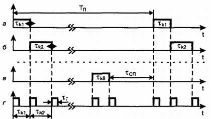 Для полного исключения взаимного влияния каналов целесообразно стабилизировать период повторения: командная посылка для двух и более каналов должна выглядеть в соответствии с рис. 1.7, г. На рис. 1.7, а, б, в показаны импульсы первого, второго и восьмого каналов, следующие с периодом повторения Тп. Между окончанием импульса последнего канала и началом очередного периода передачи должен оставаться временной промежуток, называемый синхропаузой τсп, с помощью которой на приемной стороне будет обнаруживаться начало очередного цикла передачи командной посылки.