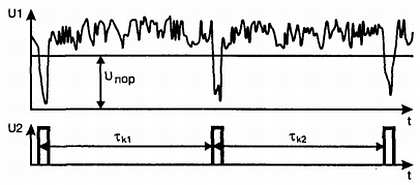 Каким бы ни был приемник (позиция 1 на рис. 1.9), принятый и продетектированный сигнал на его выходе будет представлять достаточно искаженное подобие переданной кодовой посылки на фоне шумов. На рис. 1.10 импульсы кодовой посылки в выходном напряжении U1 изображены отрицательными. Для устранения шумов и восстановления прямоугольной формы граничных импульсов (напряжение U2 на рис. 1.10), с одновременной нормировкой их амплитуды, используется компаратор напряжения (2), порог которого Uпор устанавливается ниже максимального уровня шумовых выбросов.