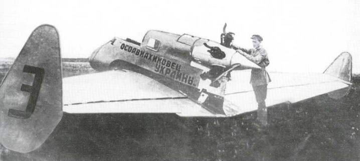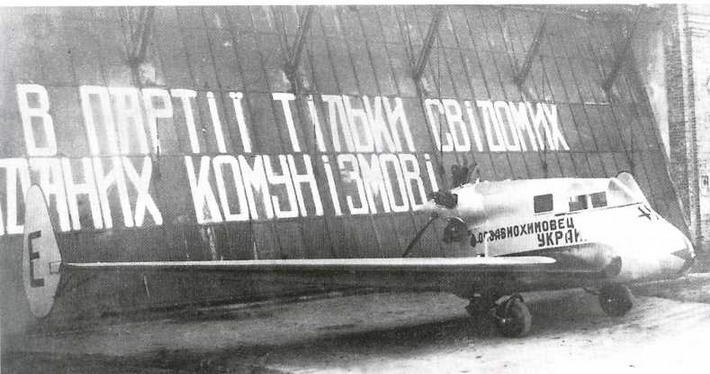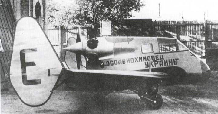 В 1933 г. там началось проектирование бесхвостого экспериментального самолета со стреловидным крылом, предназначенного для изучения особенностей устойчивости и управляемости "бесхвостки". Работы велись при финансовой поддержке Центрального совета Осоавиахима УССР, поэтому самолет назвали ХАИ-4 "Осоавиахимовец Украины". Это был цельнодеревянный моноплан с трехместной закрытой кабиной и расположенным сзади двигателем М-11 мощностью 100 л.с. Кроме чисто экспериментального назначения, самолет предполагалось использовать как туристский или связной.
