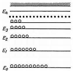 Согласно законам квантовой механики, энергия электрона в атоме не произвольна: она может иметь лишь определенный (дискретный) ряд значений E0, Е1, E2…, Еn, называемых уровнями энергии. Значения эти различны для разных атомов. Набор дозволенных значений энергии носит название энергетического спектра атома.