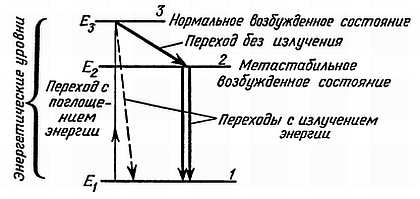 С верхнего третьего уровня возможны переходы 3 —> 1 и 3 —> 2. Оказалось, что переход 3 —> 1 приводит к испусканию энергии Е3 — Е1 = hv31, а переход 3 —> 2 не является излучательным: он ведет к заселению «сверху» промежуточного уровня 2 (часть энергии электронов при этом переходе отдается веществу, нагревая его). Этот второй уровень носит название метастабального, и на нем в итоге окажется атомов больше, чем на первом. Именно на этом уровне происходит накопление возбужденных атомов. Поскольку атомы на уровень 2 поступают с основного уровня 1 (через верхнее состояние 3), а обратно на основной уровень возвращаются с «большим запаздыванием», то уровень 1 «обедняется».