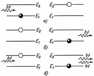 Частица (атом или ион), находящаяся в основном энергетическом состоянии (находится на уровне 1) и изображенная черным кружочком на рис. 44, а, поглощает фотон (волнистая стрелка) и возбуждается, т. е. переходит на более высокий энергетический уровень Е2 (белый кружок). Возбужденная частица (белый кружок на рис. 44, б) может спонтанно выделить энергию в виде фотона и возвратиться в основное состояние.