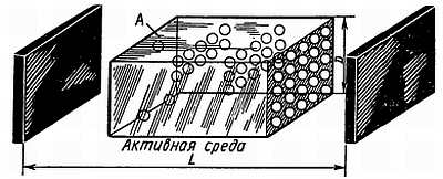 В резонаторе (рис. 45) элемент активной среды выбран в виде параллелепипеда, а в качестве резонатора выступают два плоских зеркала. В соответствии с одним из физических законов, установленных Бугером, усиление волны в инверсной системе нарастает экспоненциально с увеличением длины активной среды. Однако в реальных физических условиях существуют потери энергии, которые с ростом длины среды возрастают. Следовательно, длину активной зоны необходимо подобрать такой; чтобы потери энергии были минимальны при максимально возможном усилении излучения.