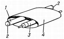 На рис. 47 показан характерный общий вид твердотельного ОКГ. Здесь 1 — активный стержень, 2 — зеркала оптического генератора, представляющие собой специально обработанные торцы активного стержня, 3 — лампа-вспышка (возможны также конструкции, использующие лампу непрерывного горения), 4 — эллиптический отражатель. В современных лазерах для более эффективной концентрации световой энергии лампы на активном стержне осветитель и рубиновый стержень располагают в фокусах эллипса.