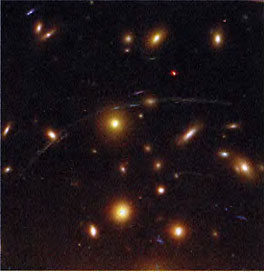 25.1. Центральная часть массивного скопления галактик Abell 1689. Голубые дуги — изображения галактик, находящихся за скоплением, растянутые и усиленные из-за эффекта гравитационного линзирования. С помощью подобных дуг измеряют массу скопления и даже распределение массы по его площади. Из этих оценок видно, что для объяснения огромной массы скопления не обойтись без темной материи, количественно превосходящей обычную в несколько раз.