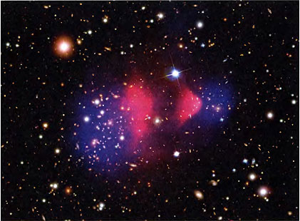 25.2. Столкновение двух скоплений галактик. Наложены три изображения: оптическое (галактики), рентгеновское (розовый цвет — горячий газ) и реконструкция распределения массы (синий цвет), сделанная с помощью гравитационного линзирования. Галактики с их звездами свободно прошли друг через друга и с ними — облака темной материи, в которых заключена основная масса (два синих облака). А газ скоплений, который по массе на порядок превосходит звезды галактик, неупруго провзаимодействовал -облака газа отстали от своих скоплений