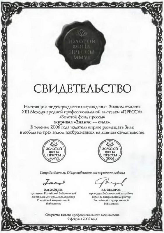 По итогам XIII Международной профессиональной выставки "ПРЕССА" журнал "Знание-сила" награжден Знаком отличия "Золотой фонд прессы", а сертификаты за вклад в совершенствование нашего журнала получили сотрудники редакции Ольга Балла, Галина Бельская, Александр Леонович, Ирина Прусс, Виктория Скобеева. Мы рады за наш журнал и поздравляем сотрудников, получивших сертификат.