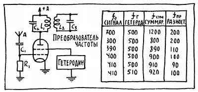 Режим лампы Л1 специально подобран так, что она создает некоторые нелинейные искажения и в результате в анодном токе появляются составляющие, которых не было ни на одном из двух входов лампы. Среди новых составляющих будет целая серия гибридов — суммарных и разностных частот «гетеродинной породы». Гетеродин создаст такие «гибриды» для каждой станции, сигнал которой попадет на сетку лампы. На рисунке приведена таблица, где можно найти несколько числовых примеров, показывающих, чему будут равны суммарные и разностные частоты для разных станций. В первом примере частота гетеродина меньше, а во втором больше частоты принимаемого сигнала, однако суть дела от этого не меняется.