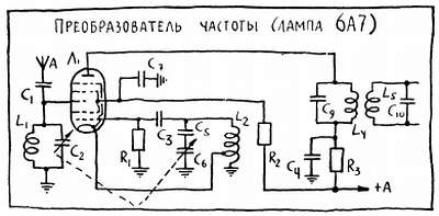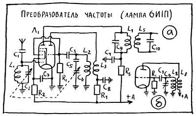 Известно, что собственные колебания в контуре затухают потому, что запасенная энергия постепенно расходуется на преодоление потерь. Теперь эти расходы восполняются за счет энергии, которая поступает в контур из анодной цепи и, при достаточно сильной положительной обратной связи потери в контуре будут полностью скомпенсированы — колебания станут незатухающими. Так ламповый генератор — гетеродин становится источником нужного нам переменного напряжения, частоту которого можно менять с помощью конденсатора и катушки. В гетеродине, так же как и во входном контуре, переход с диапазона на диапазон осуществляется переключением катушек, а плавная настройка в пределах диапазона с помощью конденсатора переменной емкости. Кстати говоря, на схемах преобразователей вы, по-видимому, узнаете и входной контур, L1С2, включенный в цепь антенны. О том, какую роль он играет в супергетеродине и почему конденсаторы С2 и С6 соединены пунктирной линией, вы узнаете в конце главы.