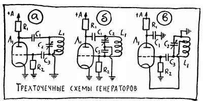 Схема генератора, примененная во втором преобразователе частоты (рис. 59), называется трехточечной. Здесь катушки обратной связи нет вообще и сама лампа подключена к контуру всеми тремя своими электродами (рис. 60).