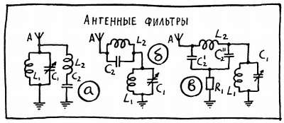 Значительно проще удается подавить помеху, частота которого равна промежуточной, — для этого в антенную цепь просто включают контур, настроенный на эту частоту. Существует несколько таких контуров — фильтров. Один из них (рис. 62, а) — это последовательный контур L2С2, который на резонансной частоте обладает очень маленьким сопротивлением и таким образом замыкает помеху накоротко с антенны на «землю». Второй фильтр называют «пробкой» — (рис. 62, б, в). Он представляет собой параллельный контур, который в отличие от последовательного обладает очень большим сопротивлением на резонансной частоте. Такой контур просто преграждает путь помехе во входную цепь приемника.