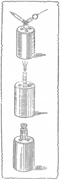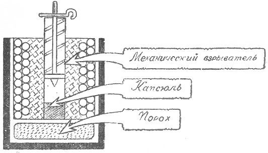 Это мы знаем, как делать. Тут нужны отрезок огнепроводного шнура и капсюль-детонатор. Составляйте зажигательную трубку. Приладим ее к днищу снаряда.