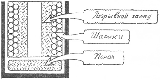 Снаряд похож на банку консервов с горохом. Внутри нее — смертоносная начинка. Банка обложена по стенкам двумя слоями блестящих шариков, словно вынутых из подшипника. Это шрапнель. Кроме того, в банке разрывной заряд. Он размечет шарики в стороны.