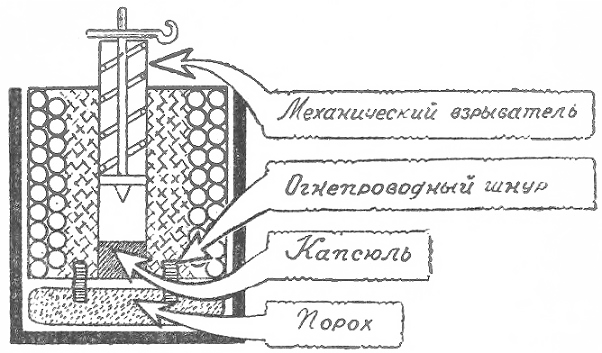 Если дернуть за бечевку, вылетит задвижка механического взрывателя, хлопнет пружина по капсюлю — первый взрыв.