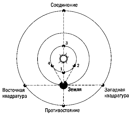 Рис. 7.2. Конфигурации планет, то есть их характерные положения относительно Земли и Солнца. По отношению к земному наблюдателю планета на внешней орбите может располагаться в соединении или противостоянии с Солнцем, а также в восточной или западной квадратурах. Планета на внутренней орбите может располагаться в нижнем (1) или верхнем (3) соединениях, а также в наибольшей восточной (4) или западной (2) элонгациях.