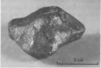Рис. 7.3. Этот метеорит размерами 9,6?8,1?8,7 см и массой 631 г, упавший в 1960 г. в Западной Австралии, специалисты считают осколком астероида Веста. Он почти целиком состоит из минерала пироксена, оптический спектр которого очень похож на спектр Весты. На Земле этот минерал обычно встречается в потоках лавы. Судя по структуре метеорита, его вещество однажды испытало плавление. Похоже, что он был выбит из глубоких недр астероида. Соотношение изотопов кислорода в нем совсем не такое, как в земных и лунных породах. Образец покрыт корой плавления, образовавшейся при полете в атмосфере Земли. Есть надежда, что после 2015 г. мы узнаем об этой карликовой планете много интересного.