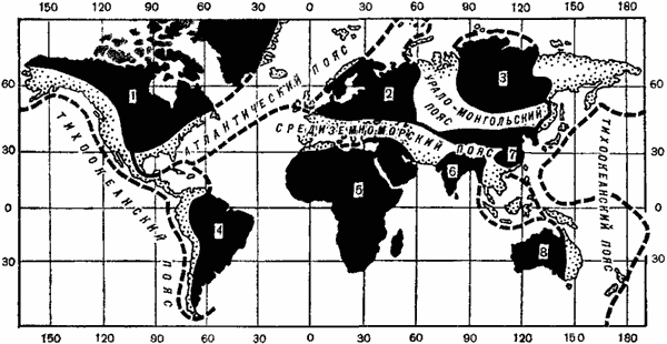 Второй класс структур земной коры — геосинклинали. Важнейшая отличительная их черта — много большая контрастность движений по сравнению с платформами. На геологической карте геосинклинальные зоны выходят в виде протяженных узких полос разного цвета. Особенно наглядно видно это на примере Урала, который, как цветной шарф, пересекает с севера на юг нашу страну. Образованию геосинклинального пояса предшествовало заложение системы разломов большей протяженности (тысячи километров) и глубокого заложения. В результате поверхность земного шара оказалась состоящей из «обломков» древних платформ, разделенных геосинклинальными поясами (рис. 2). Наиболее протяженным является Тихоокеанский пояс, обрамляющий с востока, севера и запада впадину Тихого океана. Следующий по величине — Средиземноморский пояс. Он начинается в районе Гибралтарского прогиба и протягивается через Средиземное море, Кавказ, Памир и Гималаи в Зондский архипелаг, где сливается с Тихоокеанским поясом. В пределах нашей страны находится большая часть Урало-Монгольского геосинклинального пояса. В него входят Урал, геосинклинальные структуры Казахстана, Тянь-Шаня, Алтая, Саян и большая часть Монголии. Этот пояс также стыкуется с Тихоокеанским. Кроме того, выделяют Атлантический и Арктический пояса, но они в значительной степени перекрыты океанами и на дневную поверхность выходят лишь их краевые части.