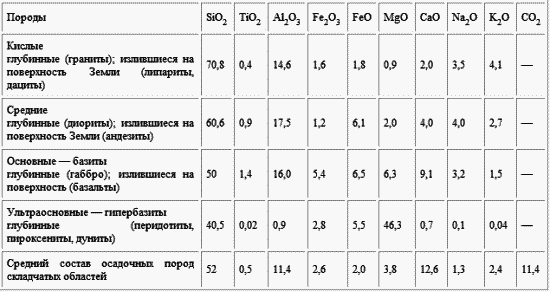 Магматические породы земной коры различаются по химизму и структуре. В зависимости от химического состава магматические породы разделяются на четыре группы: кислые, средние, основные, ультраосновные (табл. 2).