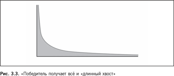 Если на графике изобразить трафик, генерируемый пользователями сайтов, доходы от интернет-рекламы, продажи мелодий в интернет-магазине iTunes, книг на сайте Amazon, приложений в интернет-магазине AppStore компании Apple или Google Play или другие данные, относящиеся к любому виду коммерческой деятельности в Интернете, он практически всегда будет выглядеть так, как на рис. 3.3. Это вездесущее распределение по принципу «длинного хвоста» является центральным элементом бизнес-моделей корпораций, доминирующих в интернет-секторе. Компании вроде Google, eBay и Amazon способны генерировать выручку в любой точке кривой распределения. Если компания контролирует большой рынок, то при агрегации пускай даже и крошечных сумм вдоль всей кривой общая сумма выручки может легко достигать миллиардов.