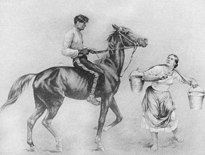 Ночью, в одной изорванной окровяненной исподнице прибежала Аксинья в хутор, давясь рыданьями валялась в ногах у матери, рассказала... Мать и старший брат, — атаманец, только что вернувшийся со службы, запрягли в [дроги] бричку лошадей, посадили с собой Аксинью и поехали туда к отцу. Брат за 8 верст чуть не запалил лошадей. Отца нашли возле стана. На разостланном зипуне спал он, пьяный, возле валялась порожняя из-под водки бутылка. На глазах у Аксиньи брат отцепил от брички барок, ногами поднял спящего отца, что-то коротко спросил у него и ударил окованным железом барком старика в переносицу. Вдвоем с матерью били его часа полтора, всегда смирная престарелая мать исступленно дергала на обезпамятевшем муже волосы, брат бил ногами. Аксинья лежала под бричкой укутав голову, молча тряслась...
